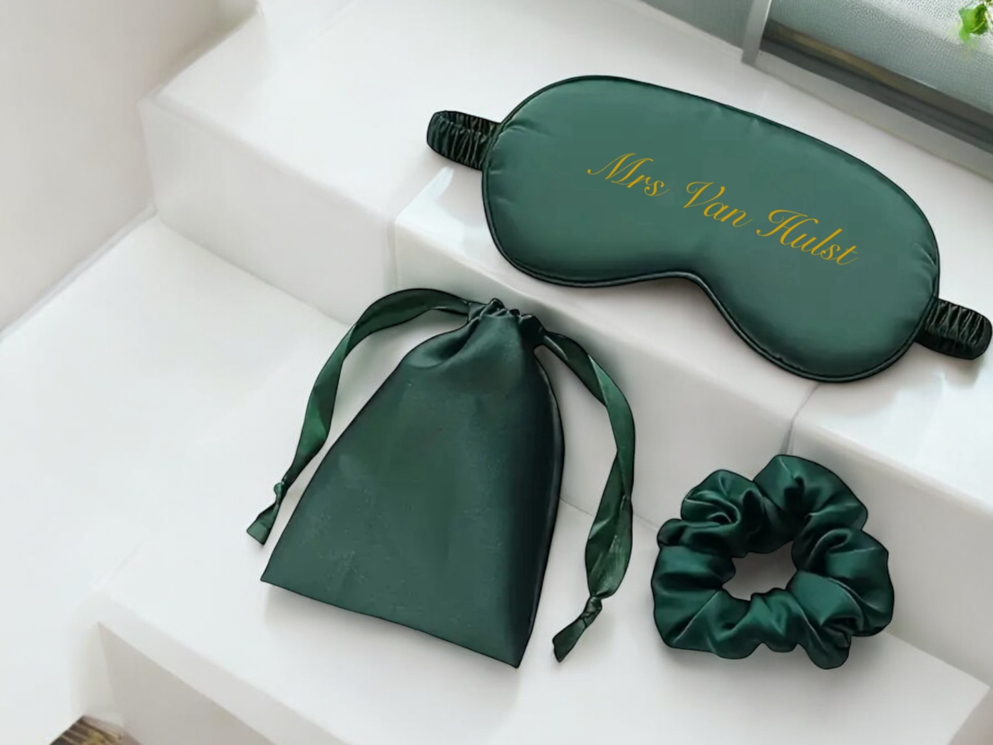 Maak je bruiloft nóg specialer met onze gepersonaliseerde satijnen slaapset, perfect als cadeau voor de bruid en haar bruidsmeisjes. Deze luxe set bestaat uit een zijdezacht slaapmasker, een bijpassend haarelastiek en een stijlvol opbergzakje, allemaal gemaakt van hoogwaardig satijn.