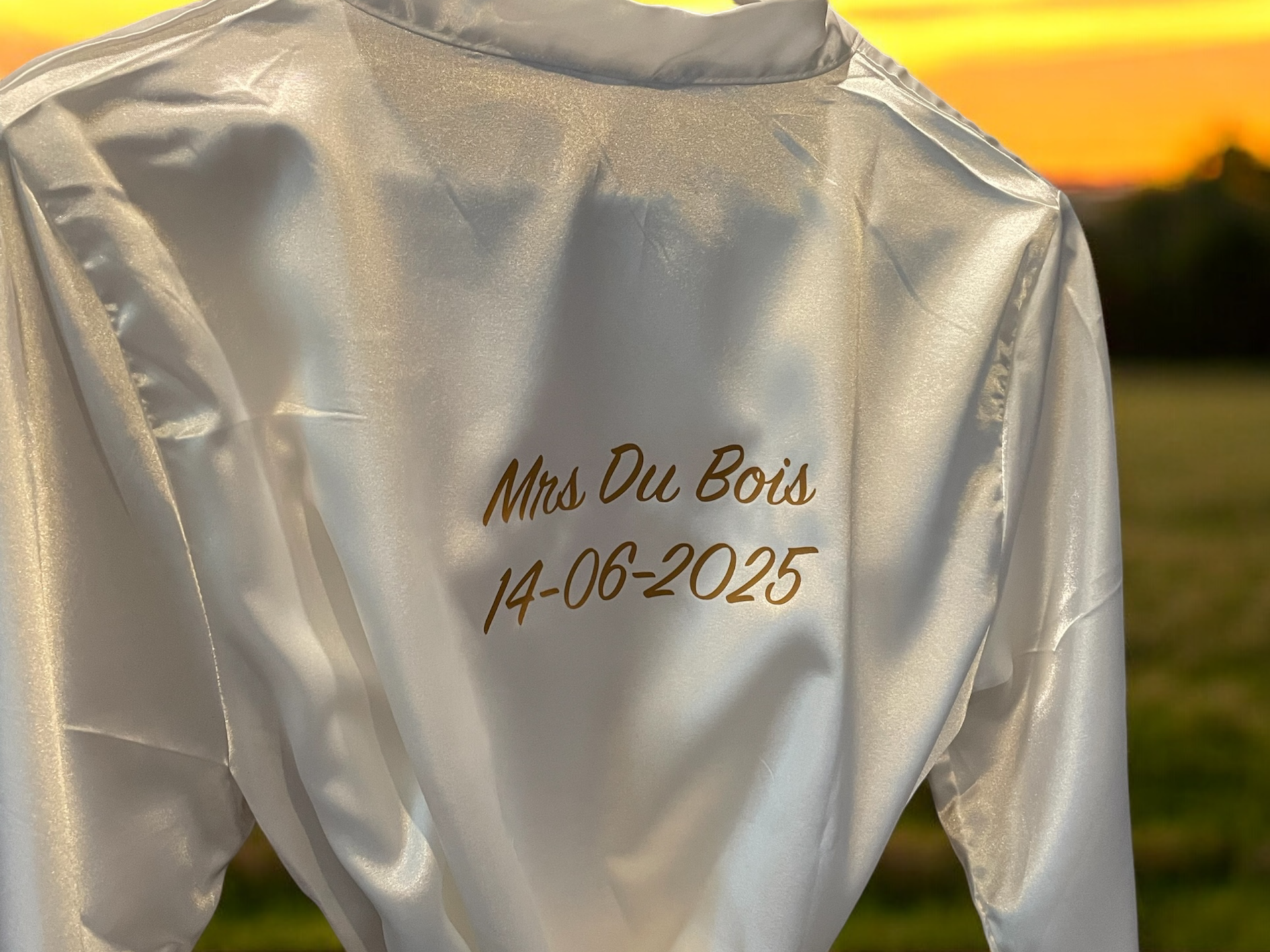 Verwen jezelf op je speciale dag met onze gepersonaliseerde lange satijnen kimono! Deze luxueuze kimono biedt ultiem comfort en stijl, perfect voor de bruid tijdens het ontspannen voor de ceremonie of het genieten van de huwelijksnacht.