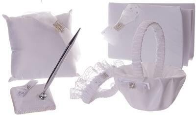 een ringkussen, een gastenboek, een pen met penhouder, een strooimandje en een kousenband.