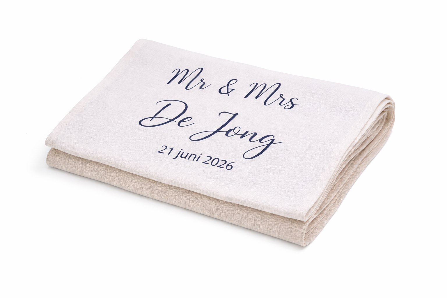 Onze gepersonaliseerde tafelloper is de eyecatcher op jullie huwelijk tafels! Ze wordt geheel naar wens gepersonaliseerd in het zwart, zilver of goud.