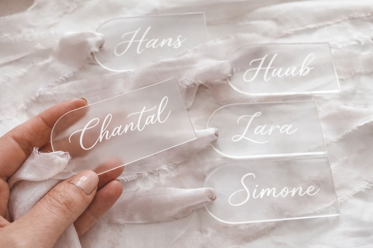 Maak jullie bruiloftstafel compleet met deze stijlvolle, op maat gemaakte acryl naamlabels.